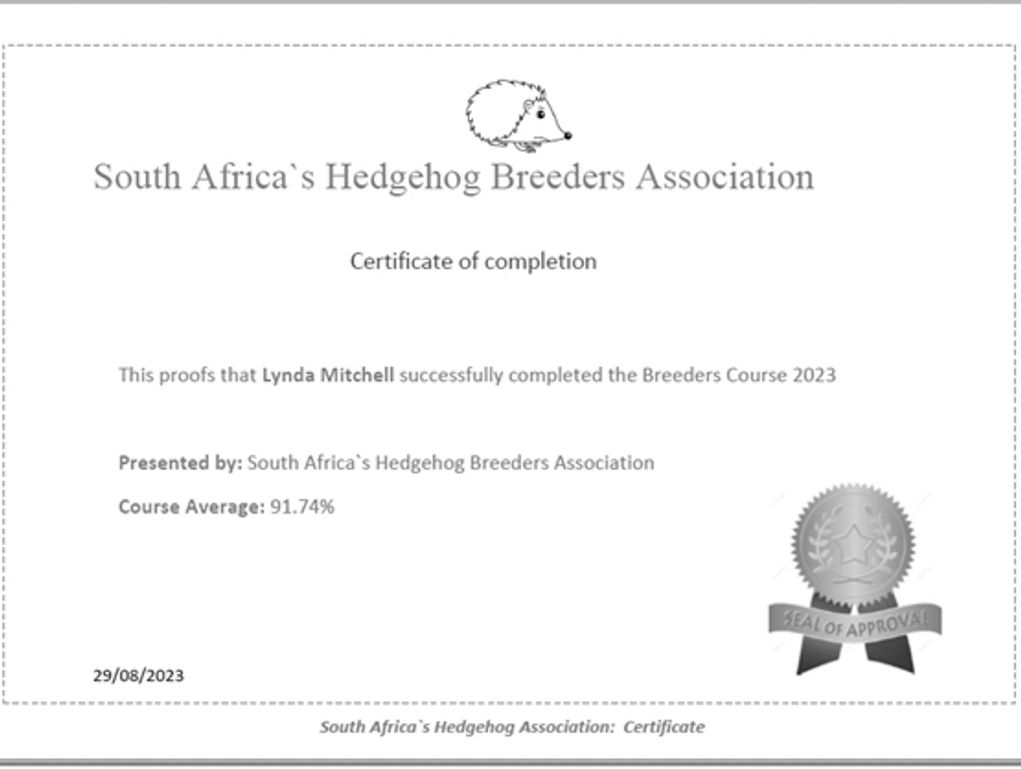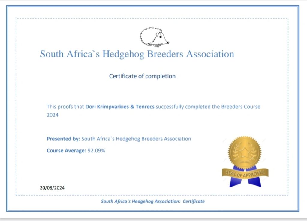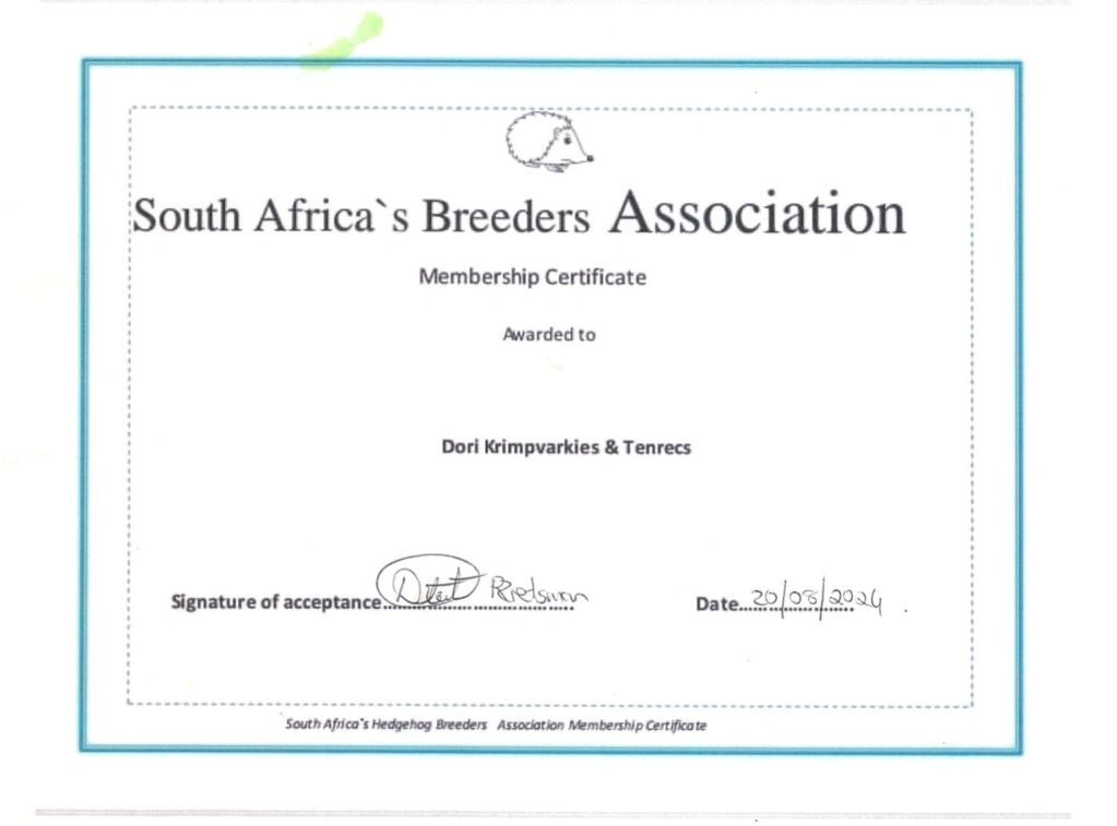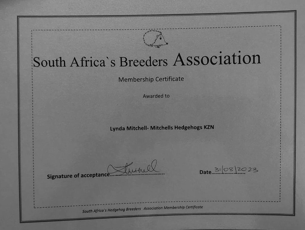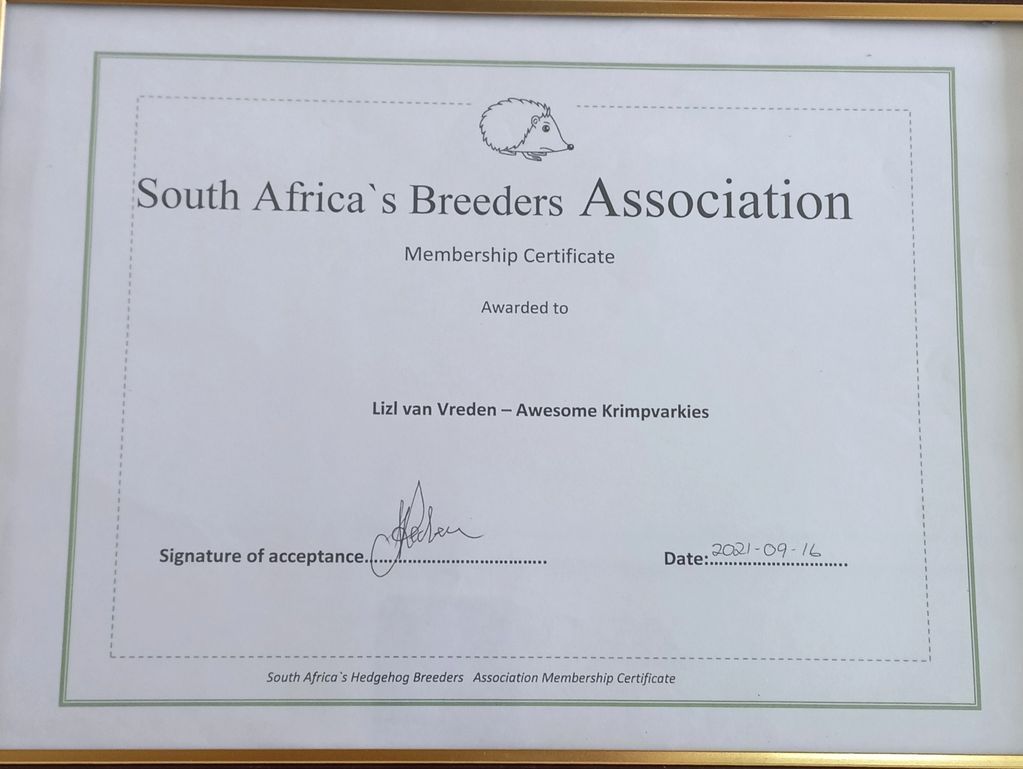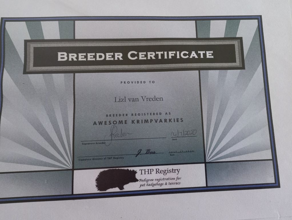 Lizl van Vreden - Awesome Krimpvarkies. Proof of Membership of the former International Breeders Registry The Hedgehog Program- This registry closed down in 2021.